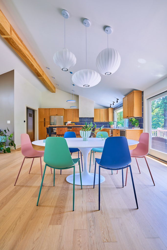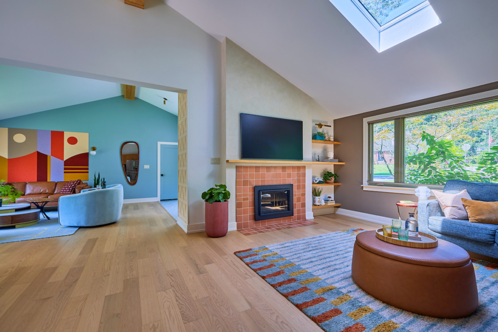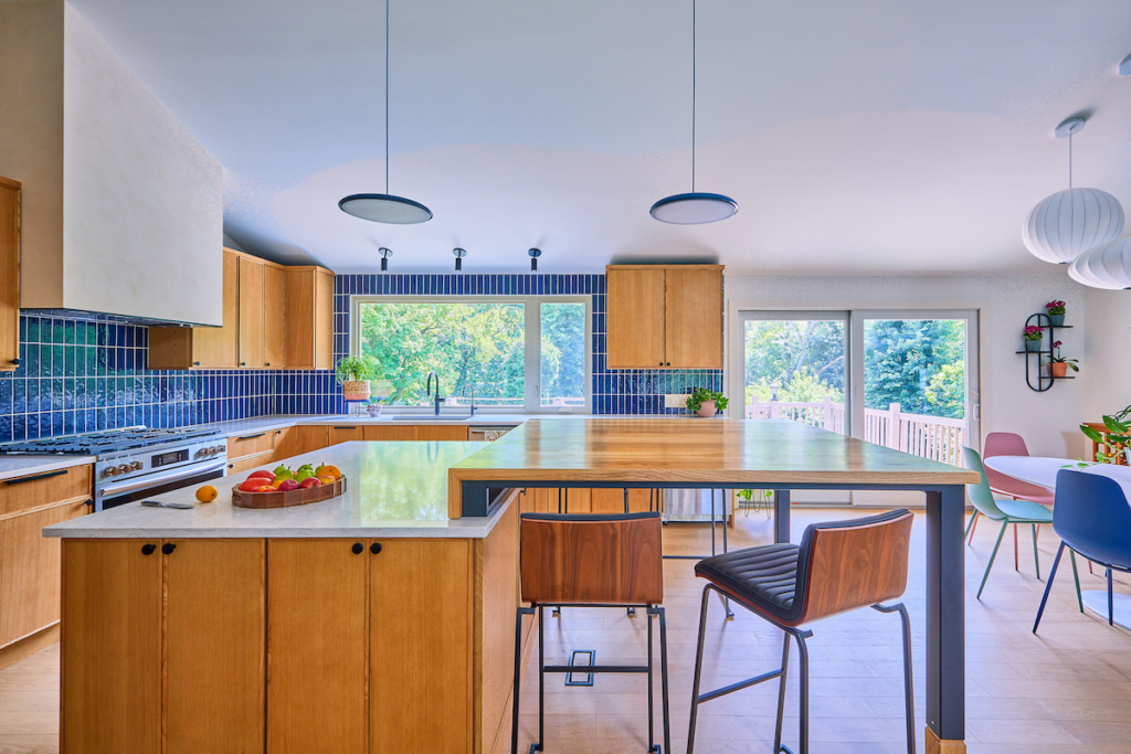 Raising the ceilings was essential, because Julie and Daniel have a huge extended family who are very tall! To accentuate the soaring cathedral ceiling, we added skylights to frame the sky; expanded windows to frame the trees. Sunlight now comes in from every direction, dancing from wall to wall through the day.