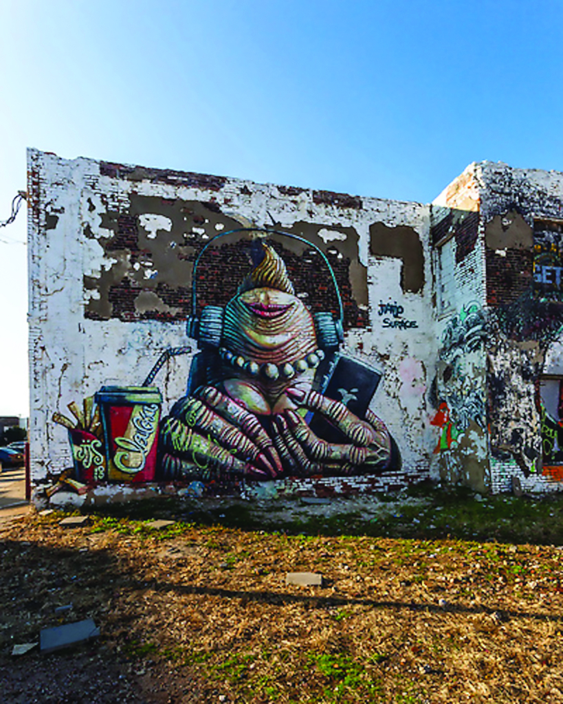 At 200 Poplar St., Vasquez and Suarce brought that philosophy to life. Their murals blended surreal figuration with bursts of color and line, evoking hybrid creatures and half-human mythologies – legendary monsters, in the best sense – drawn from imagination and subconscious.