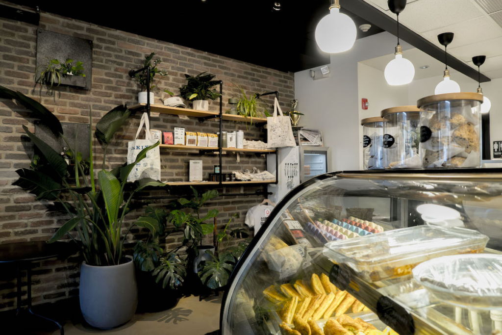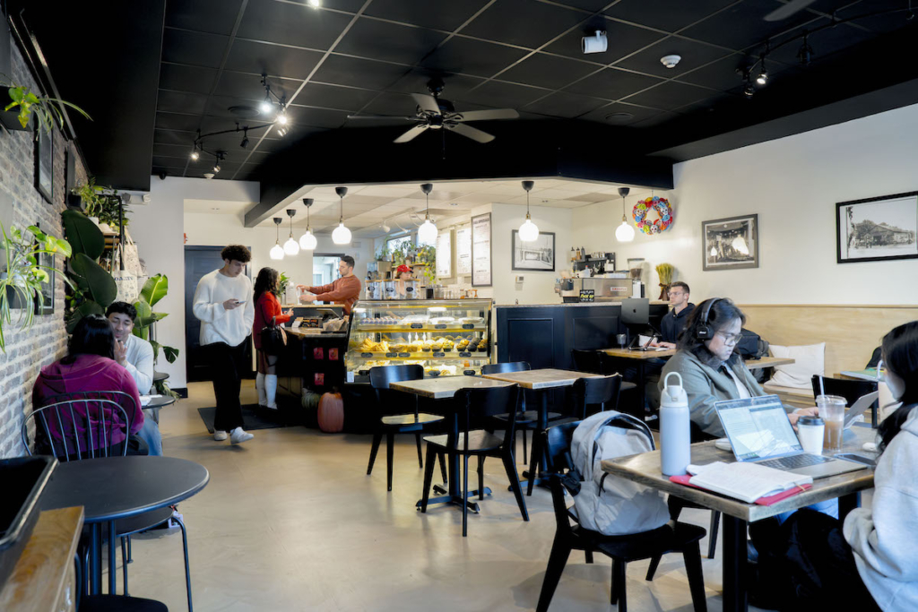 The spacious interior of the shop is inviting and opens to a modern coffee shop with an industrial design, aesthetic and warm, ambient lighting.