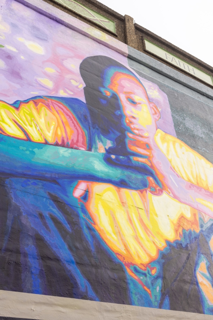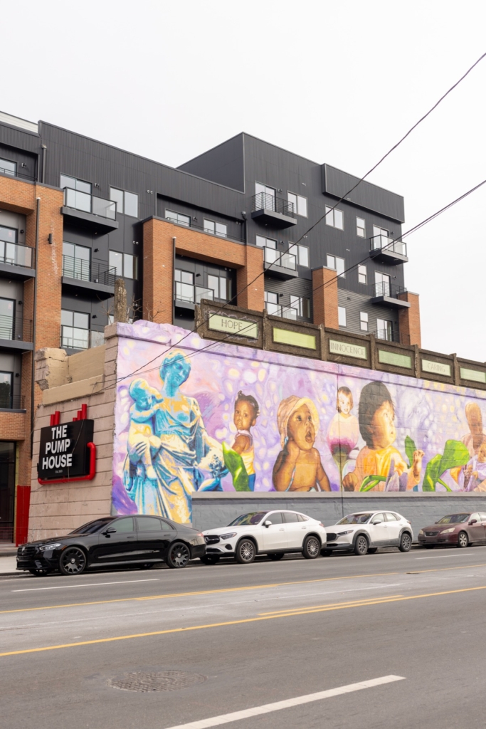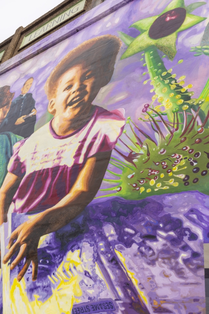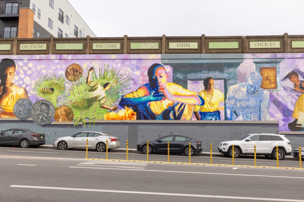 On East Lehigh Avenue, a long mural stretches across a bridge wall, unfolding like a slow-moving film. Painted in 2005, “My Life, My Path, My Destiny” is not a single image but a sequence of moments — choices, missteps, hopes, and transformations — rendered across a span of the neighborhood. This mural depicts the human life cycle from infancy to adulthood. In the middle, there is an image of a child caught in a Venus flytrap, which represents “pressure” and the “lure of drugs and easy money,” according to Mural Arts Philadelphia’s written description. Created by the Philadelphia muralist Cesar Viveros with the involvement of at-risk male youth from St. Gabriel’s Hall, incarcerated men, and local residents, the mural remains one of the most ambitious narrative works in Philadelphia’s public art landscape. This mural was made possible by conversations with the community — knocking on doors and putting up flyers to get the word out about the project, carrying it from seedling to flourishing sapling to a fully grown tree.