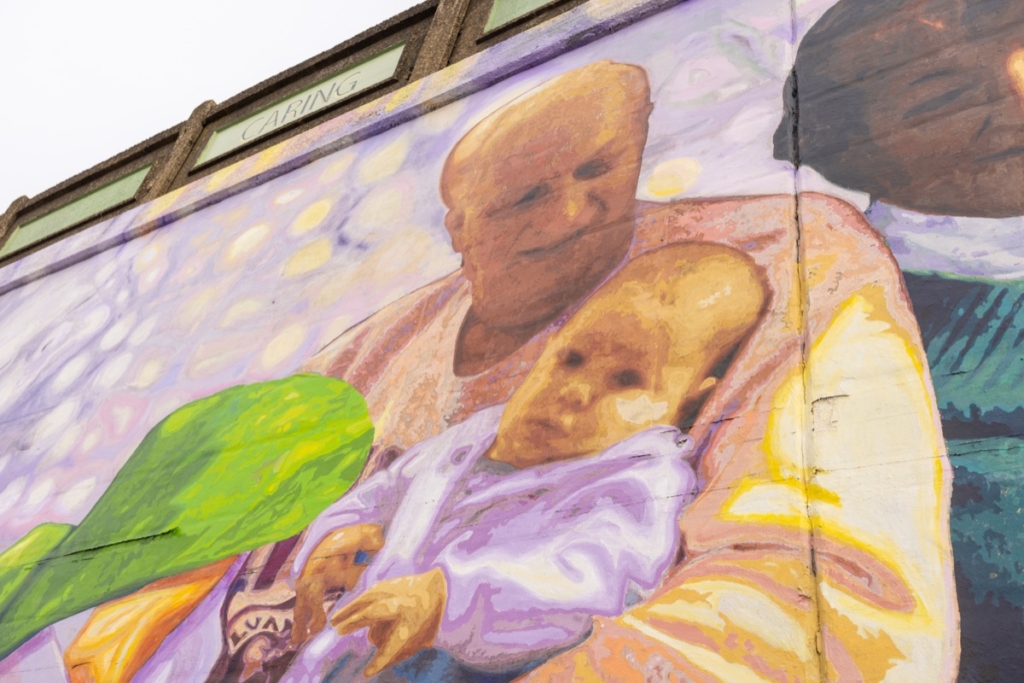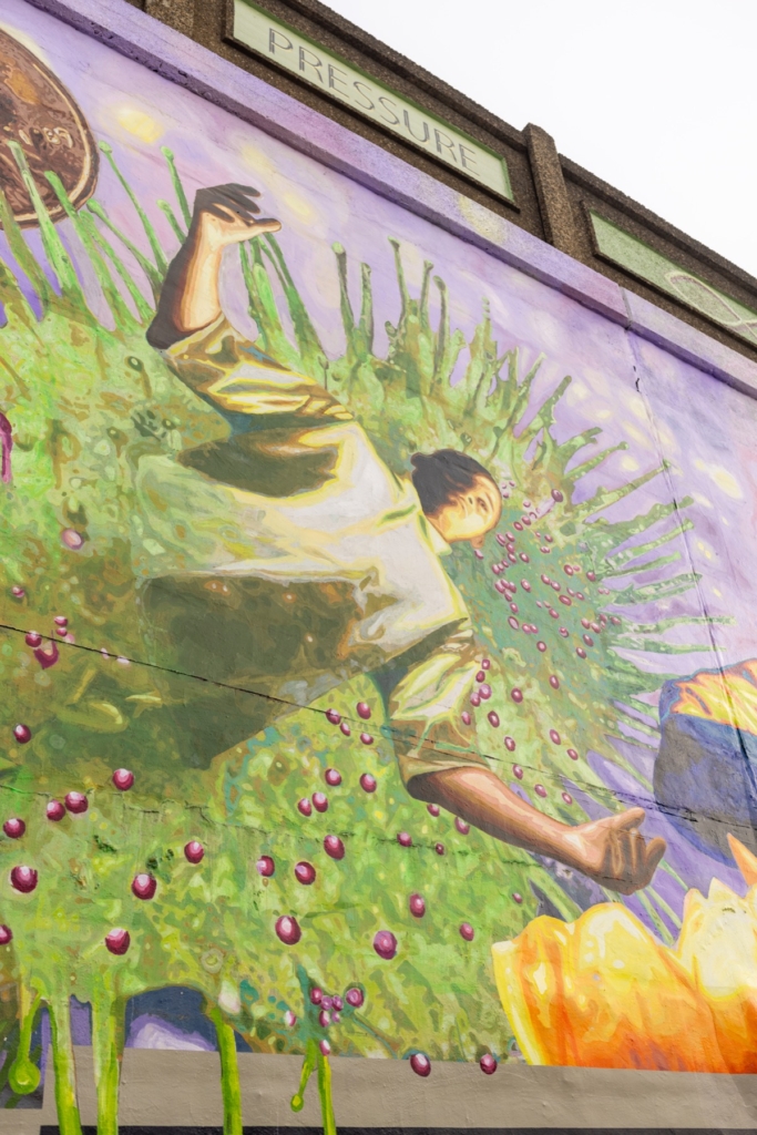 The mural confronts uncomfortable truths. Scenes of family, care, and encouragement — a grandfather holding his grandchild, a female teenager with her hands over her chest and her womb, another teenager with her arms outstretched like a bird — are punctuated by darker imagery — temptation, confinement, and risk — motifs of drugs and easy money. One of the mural’s most striking metaphors is a Venus flytrap, which is overlaid near faces of teenagers. “It’s attractive, sweet, and then it traps you,” Viveros explains. For him, the plant embodies the dangers facing teenagers without guidance, exposed to systems that promise escape but deliver confinement instead. Yet this is a piece that challenges fatalistic views. Adult figures emerge from the Venus flytrap. A door which was once closed is now open. Books appear. Bodies lean forward, arms stretched upward, hands over hearts.