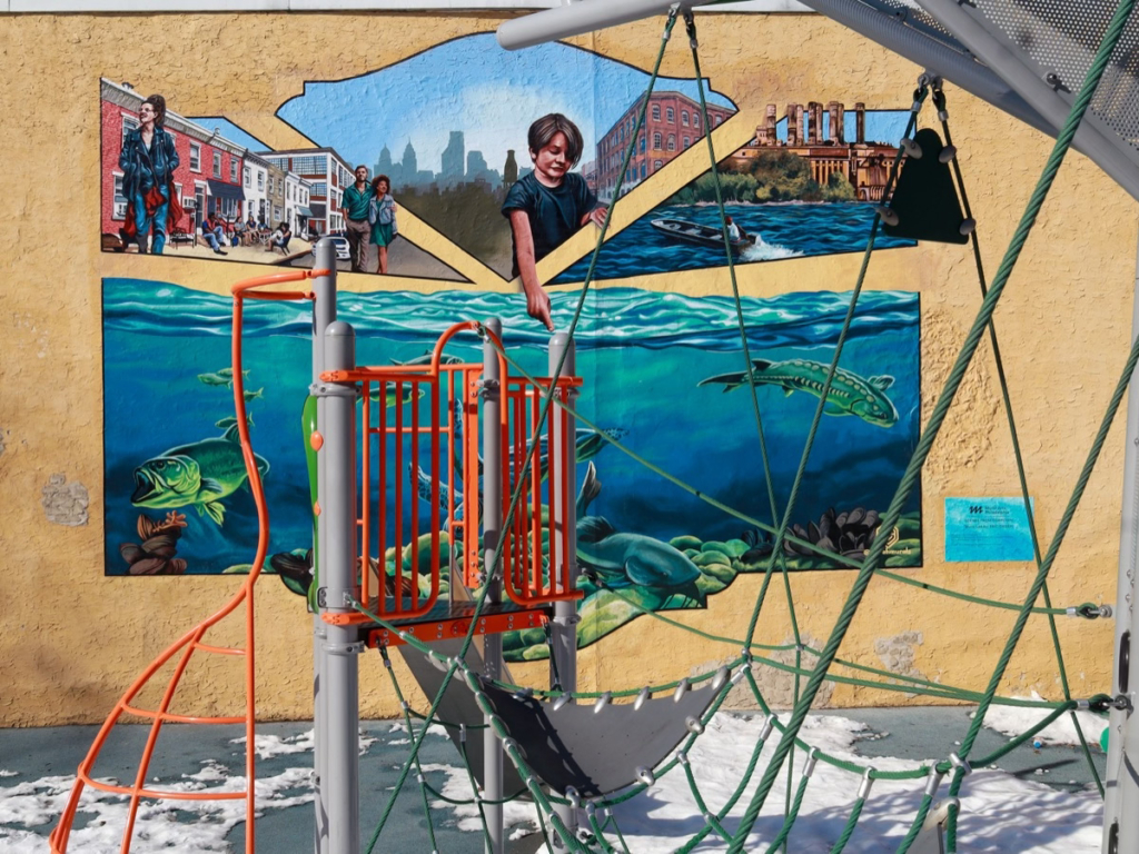 In “Scenes from Fishtown,” the mural’s central figure — a young boy leaning toward the fish below — faces a playground, designed to be filled with children. “This is in front of a playground, so I definitely wanted kids to identify with the mural and be taken in by it,” Okdeh says. The child’s curiosity mirrors the artist’s own hopes for the work. “It’s just a curious kid. And I hope this is a mural that’s in front of a lot of curious kids.”