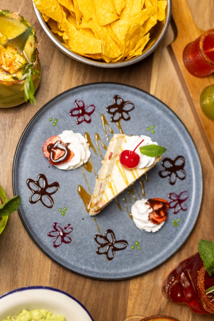 The dessert menu highlights traditional Mexican sweets like tres leches cake, Mezcal cheesecake, churros, and flan.