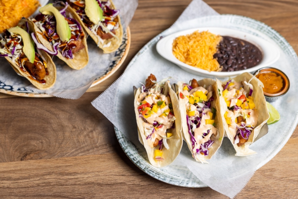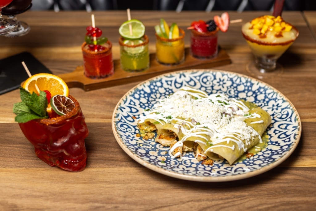 Standout menus include tropical ceviche, made with citrus-marinated fish, shrimp, avocados, jalapeños, tomato, onion, lime, mango, salt and cilantro; the new-to-the-menu birria ramen, which has two birria rolls on the side to dip into the ramen consommé; OMG Nachos smothered in chicken, chorizo, applewood bacon, refried beans, pico de gallo, sour cream, guacamole, and pickled jalapeños; tiger-shrimp tacos covered in a mango-coconut sauce with mango habanero relish; the Burrito Texano stuffed with grilled chicken, beef, and shrimp in a cheese and mango sauce; and Enchiladas El Jefe, with carne asada, grilled corn, and onions with queso fresco and corn sauce.